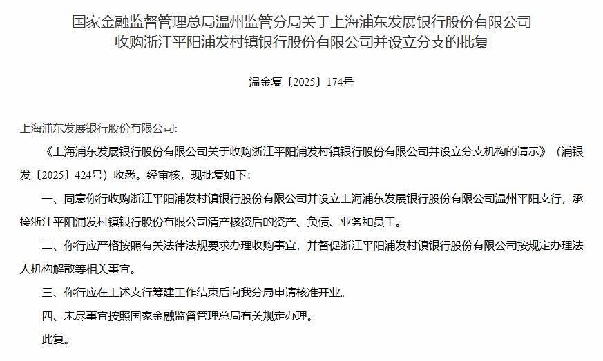 日前,国家金融监督管理总局温州监管分局发布《关于上海浦东发展银行股份有限公司收购浙江平阳浦发村镇银行股份有限公司并设立分支的批复》,同意浦发银行收购浙江平阳浦发村镇银行股份有限公司并设立上海浦东发展银行股份有限公司温州平阳支行,承接浙江平阳浦发村镇银行股份有限公司清产核资后的资产、负债、业务和员工。